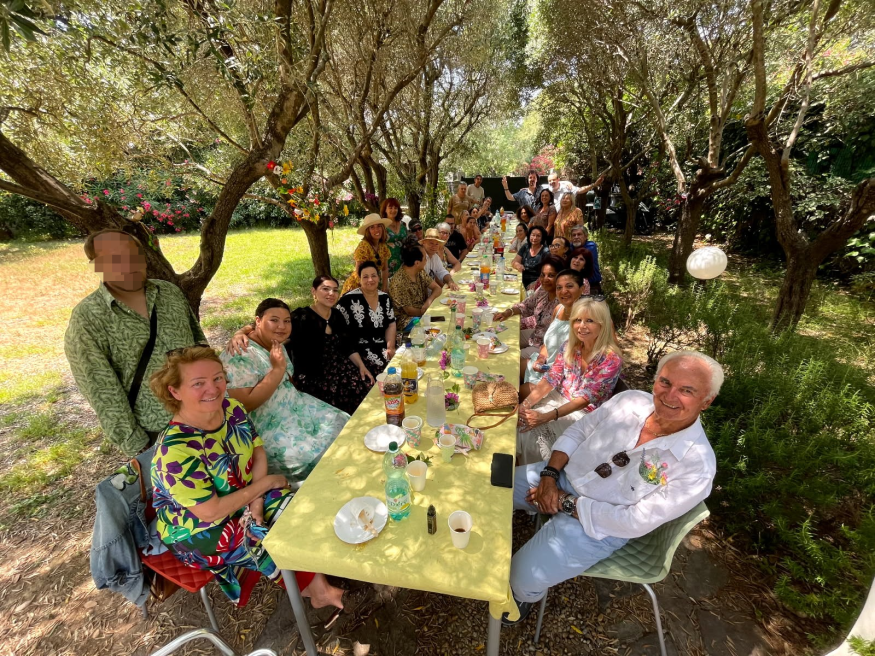 En effet, c'est autour d'un buffet champêtre composé de mets gourmands préparés par chacun et à partager, que tout ce joli monde s'est réuni. Dress code floral à l'ordre du jour afin d'échanger, en toute légèreté, à l'ombre des oliviers qui se dressent à l'entrée de cet étébalissement ouvert du lundi au vendredi.