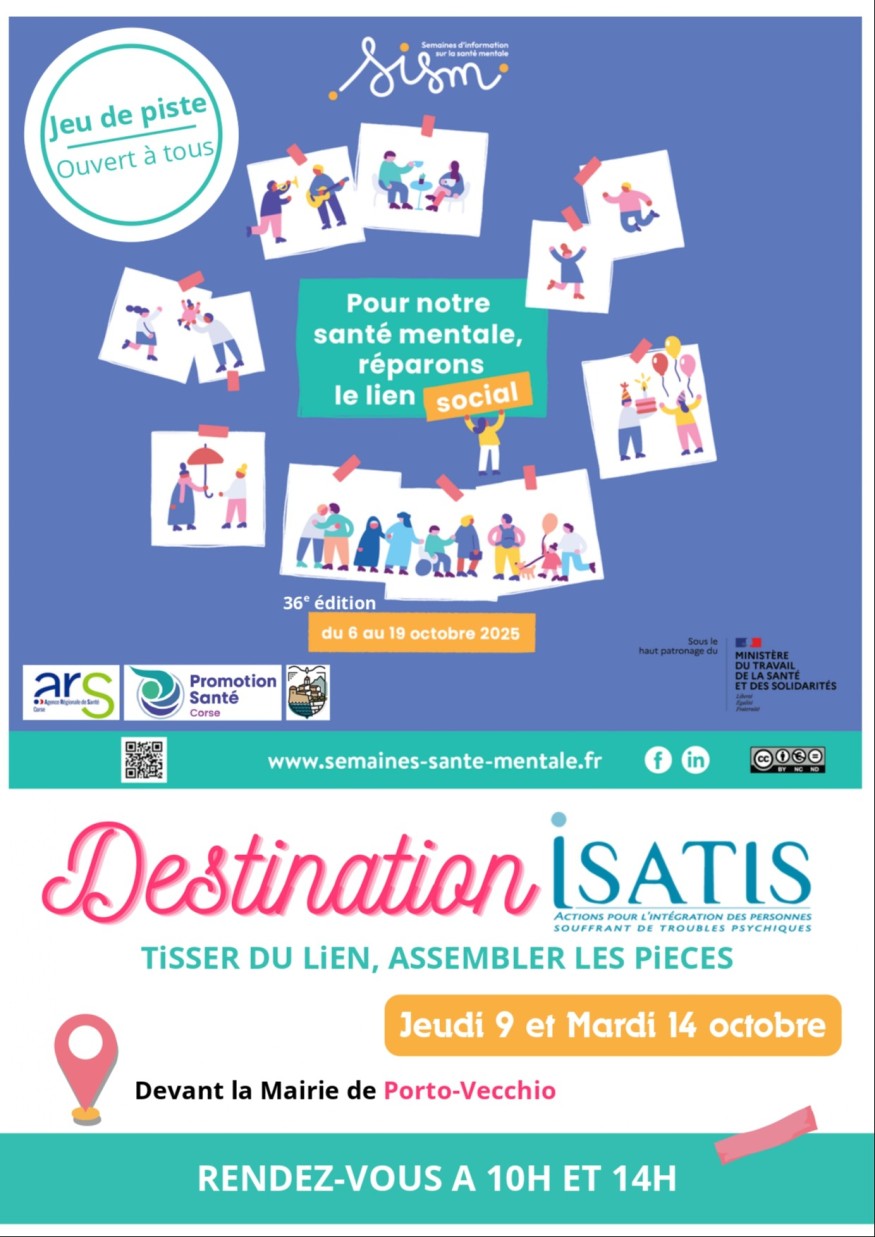 Découvrez en image, Tisser du lien, rassembler les pieces,  une action originale pensée et mise en oeuvre en octobre dernier à l'occasion des Semaines nationales d'Information sur la Santé Mentale, par une équipe toute aussi originale selon Isabel ROSAZ, Directrice territoriale des services ISATIS implantés en Corse :